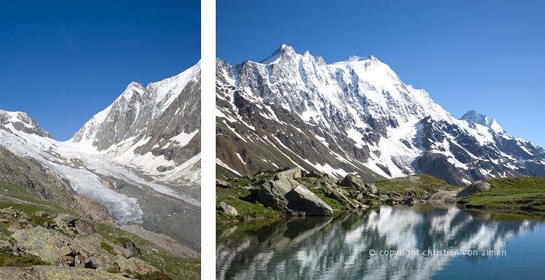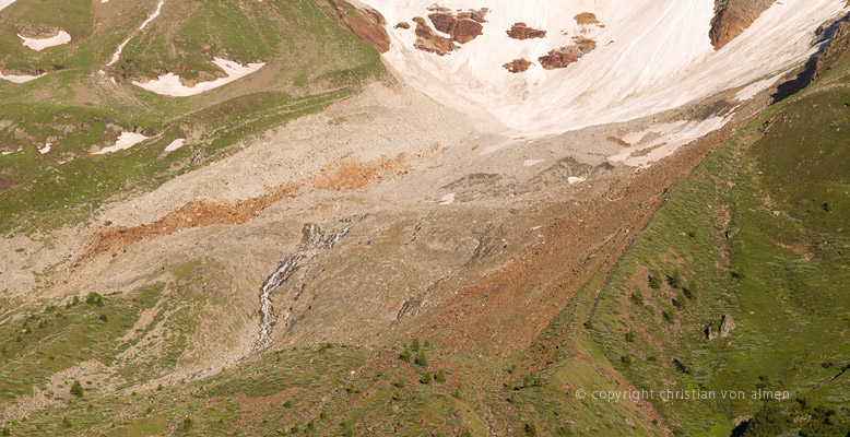 Ach, der Tag ist viel zu kurz! Schon fast neunzehn Uhr. Kaum zu glauben, denn die Sonne scheint noch warm und hell herunter. Der Gedanke an den langen Rückweg setzt meinen Träumereien ein Ende. Darum Rucksack schultern und los geht’s bergab. Im kühlen Schatten lege ich das letzte Wegstück zurück. Während dem gegenüber vor mir das Gletschervorfeld des Dischliggletschers mit seinen Seitenmoränen im späten Sonnenlicht warm zu mir herüber leuchtet.