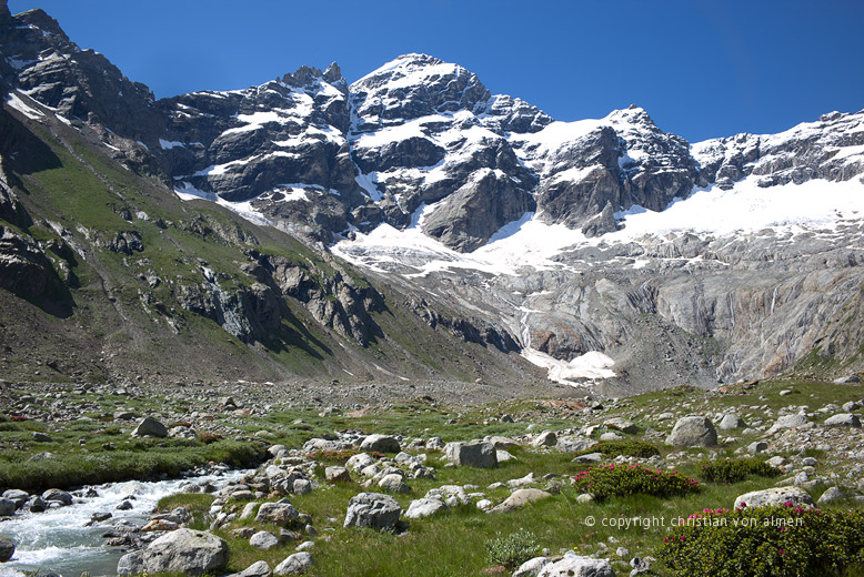 Bergblumen säumen den Weg entlang der Gugginenalp. Dort wo er den Anubach überquert, biege ich links ins Jegital ein und folge ihm zu seiner Quelle. Prächtig sieht der Talkessel mit dem frisch verschneiten Breithorn, dem Bergbach und den blühenden Alpenrosenstauden aus. „Ca vaut la détour“. Vor vielen Jahren habe ich das Breithorn mit meiner damaligen Partnerin bestiegen. Fafleralp-Breithorn-Fafleralp retour, in einem Tag, im Spätherbst. Auf dem Gipfel hatte uns ein Adler umkreist, sichtlich enerviert ob der Ruhestörung, so spät im Herbst. „Nie hat man seine Ruhe“, dachte er sich wohl.