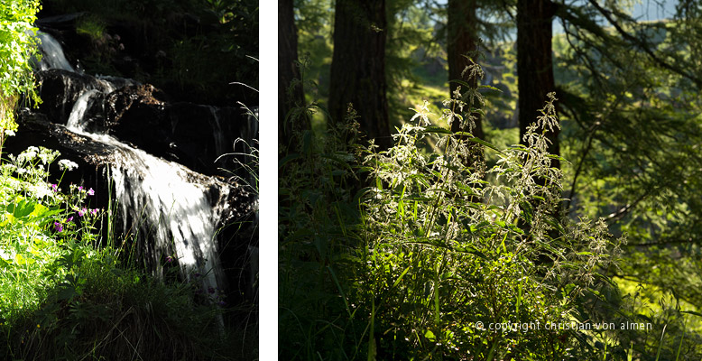 Vereinzelt finden Lichtstrahlen ihren Weg durch das Geäst und verzaubern den Wald um mich herum. Und zwischen Kerbel, Blumen und Gräsern fliessen Quellwasser vergnügt über Stock und Stein.