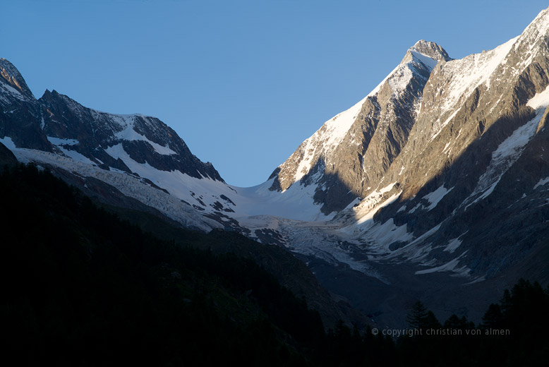 Mit der einsetzenden Dämmerung erreichte ich den Talgrund. Ein letzter, wehmütiger Blick zurück auf die Lötschenlücke, auf den Anugrat links und auf das besonnte Sattelhorn rechts.
