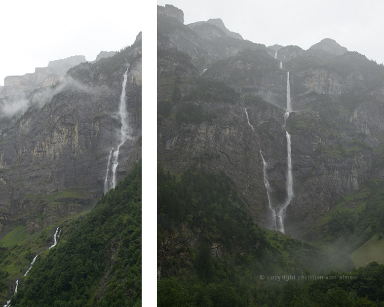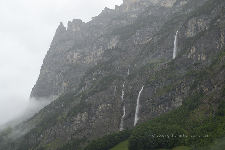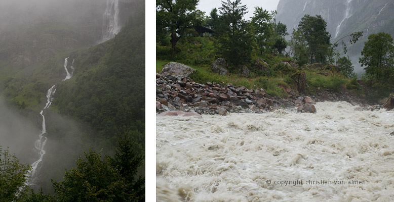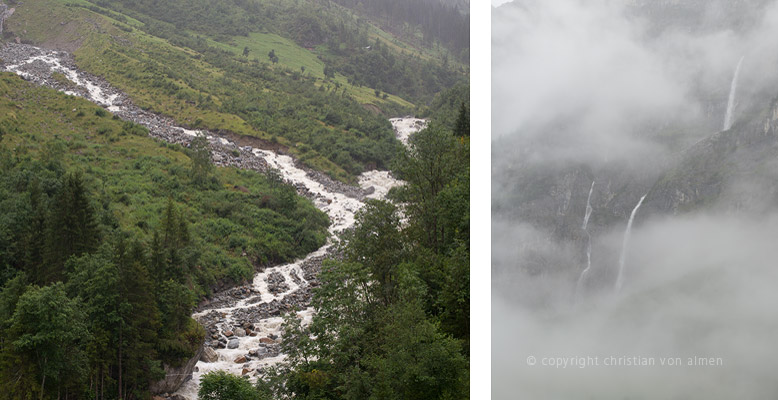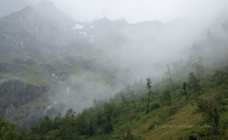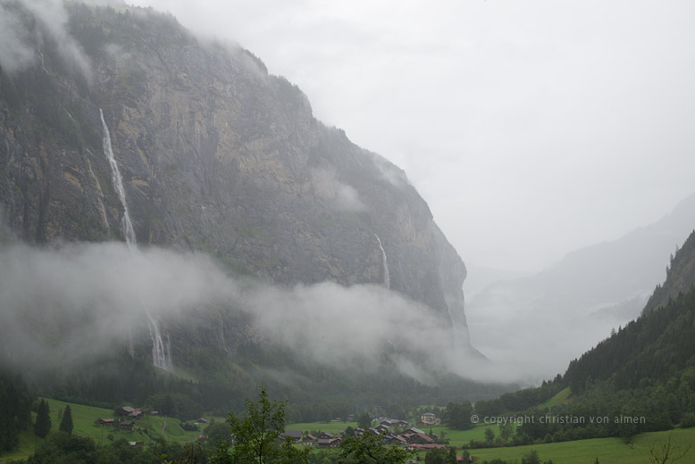 Nach einer knappen Stunde Abstieg erreiche ich wieder den Stechelberg. Letzter bewohnter Ort im Lauterbrunnental. Ausgangspunkt zu prachtvollen Wanderungen im Hinteren Lauterbrunnental. Der Dauerregen hat ein wenig nachgelassen. Links im Bild der Mürrenbach, mit 417 Metern der höchste Wasserfall der Schweiz. Weiter talauswärts der Ägerterbach. Ganz hinten liegt, vom feuchten Nebeldunst verhüllt, das Dorf Wengen.