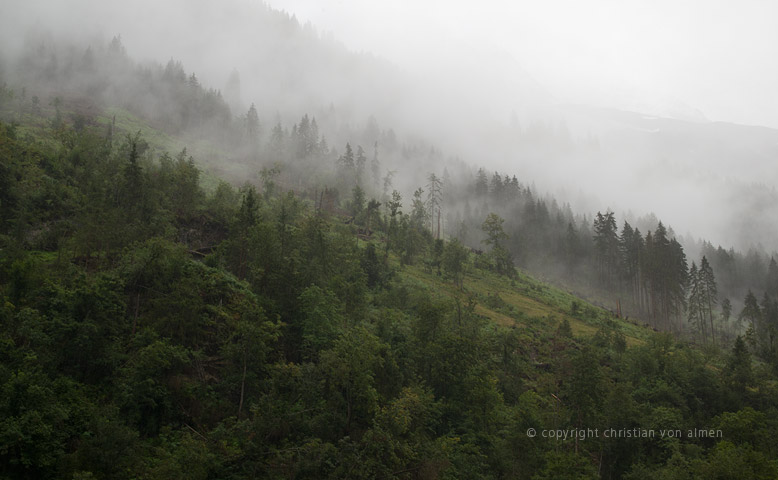 Bevor das Christentum in unsere Täler kam, und noch bis in die Neuzeit hinein, waren für uns die zerstörerischen Naturkräfte das Werk von Dämonen und Urkraftwesen. Sie trieben in unseren Bergen mit uns ihren Schabernack und Spuk. Wenn ich bei Nebel, Regen, Sturm und Gewitter, bei Tag und bei Nacht unterwegs bin, weitab von jedem schützenden Dach, dann werden die Erinnerungen daran wieder wach. Darüber mag die aufgeklärte Leserin, der aufgeklärte Leser jetzt vielleicht nachsichtig lächeln. Mich hat‘s auf jeden Fall schon ein paarmal, ob den geheimnisvollen Gewalten, kalt im Nacken gepackt.