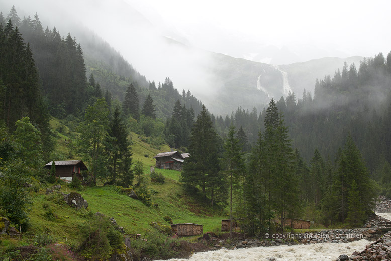 Bei Trachsellauenen, einem wildromantischen Ort mit kleinem Hotel und Restaurant, von dessen beschaulicher Terrasse sich bei schönem Wetter ein imposanter Blick auf das Breithorn und die Schmadribach-Fälle öffnet, kehre ich um. Keinen Menschen habe ich angetroffen. Wen wundert‘s, bei diesem Wetter schickt man nicht einmal Hunde vor die Türe.