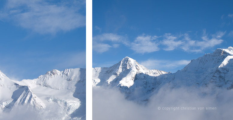 Oben angekommen warte ich im Restaurant den späten Nachmittag ab, führe mein Fototagebuch nach und hoffe, dass der Nebel wieder sinken möge. Und tatsächlich, die Geduld zahlt sich aus. Die Wolkendecke reisst auf. Die letzten Sonnenstrahlen beleuchten das Birg. Wie spielzeugklein wirkt doch das Stationsgebäude gegenüber den drei mächtigen Riesen im Hintergrund.