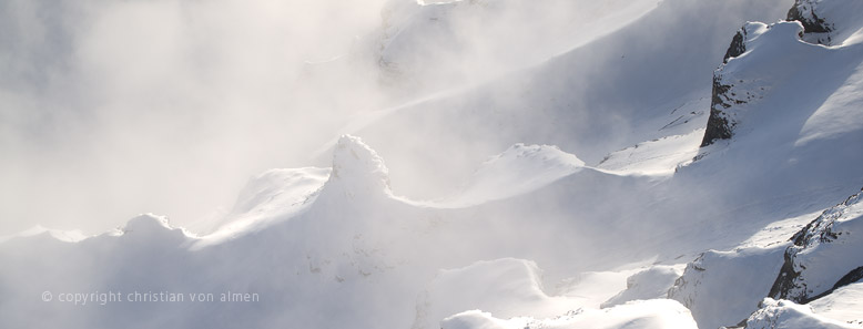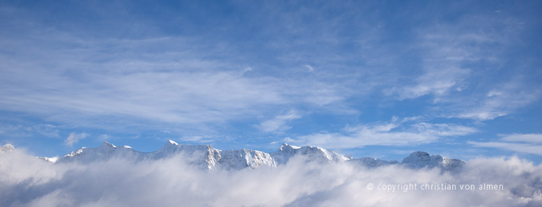 Seit ein paar Tagen liegen die Täler unter einer kompakten dunkelgrauen Bisnebelschicht. Schwer wie ein Betondeckel lastet sie auf Gemüt und Landschaft. Selbst tagsüber brennt das Licht meiner Lampe auf dem Arbeitstisch. Doch dann endlich, an einem späten Morgen, schimmert ein zaghaftes Weiss durch die trübe Wetterbrühe. Schnell sind meine sieben Sachen gepackt. Eine knappe Stunde später stehe ich in Stechelberg bei der Talstation der Schilthornbahn. Hier mischt sich bereits etwas Himmelsblau mit dem Grau des Nebels. Ein untrügliches Zeichen, dass, ein paar hundert Höhenmeter über mir, die Sonne scheinen wird.