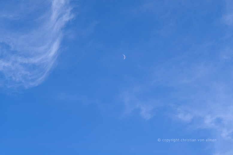 Doch glücklicherweise habe ich noch einen Joker im Ärmel. Kurz entschlossen besteige ich die nächsten Kabine Richtung Schilthorn, lasse ein weiteres Mal die graue Tristesse hinter mir, schwebe schon bald umgeben von dem kalten, hellweissen Blau des Winterlichts gipfelwärts. Einsam steht der Mond, in seinem ersten Viertel, zwischen Cirruswolken am Himmel.