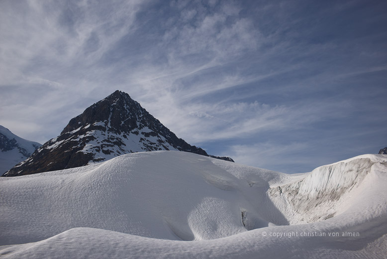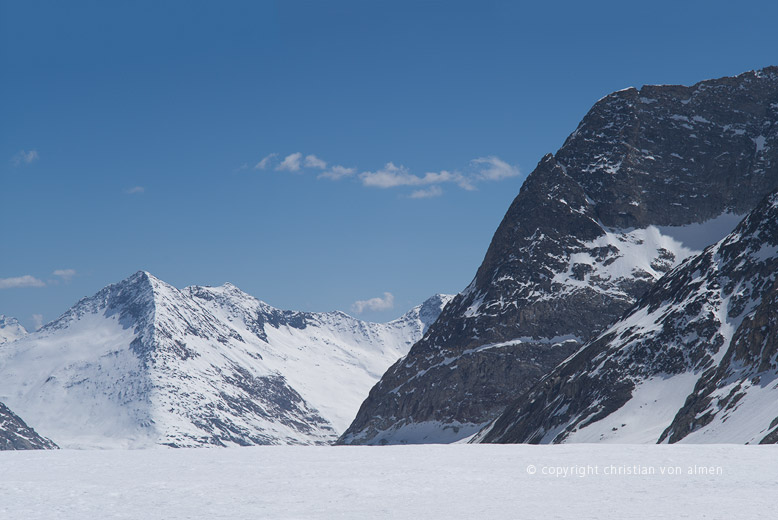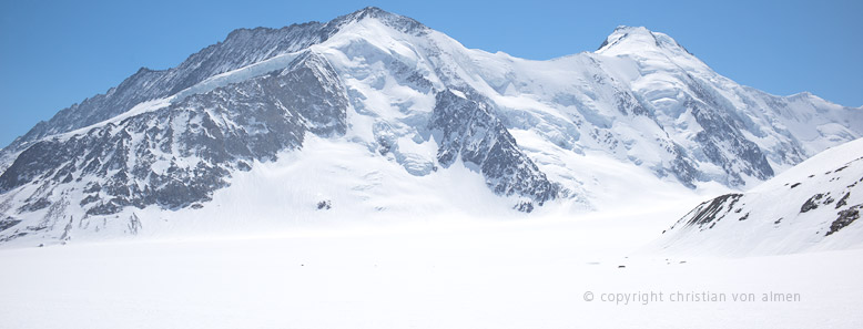 Eine kleine Ewigkeit dauert es bis der Konkordiaplatz, dessen Distanzen nicht ganz einfach zu schätzen sind, hinter mir zurück bleibt. So mühelos und genussvoll wie heute gelingt die Durchquerung nicht immer. Komme mir wie in einem fahrenden Zug am Fensterplatz sitzend vor. Mit mässigem Tempo gleite ich auf meinen Skiern dahin. Schaue mal links dann wieder rechts und wieder links, so wie es mir gerade beliebt. Ab und zu werfe ich einen aufmerksamen, wachsamen Blick nach vorne. Doch der Gletscher liegt spaltenlos, gut verschneit, mit kompakt tragender Oberfläche vor mir, wie ein weisser ausgerollter Teppich.
