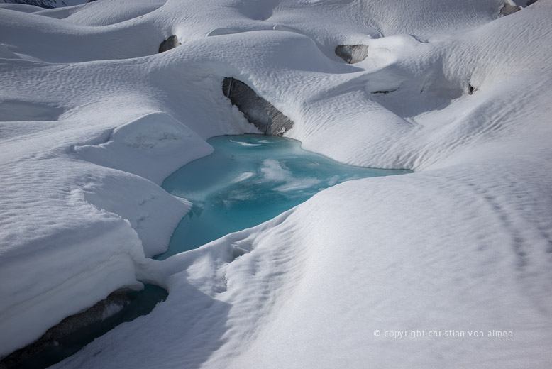 Geradeaus, in Fahrtrichtung, noch in beträchtlicher Ferne erhebt sich das Eggishorn. Der Nordgrat scharf wie ein Schiffsbug. Er teilt den Gletscher, der längste der Alpen, in zwei Arme auf. Doch derjenige nach Fisch hinunter ist seit Menschengedenken abgeschmolzen. In den vergangenen rund 150 Jahren hat auch der Hauptstrom fast zwei Drittel seines Eisvolumens eingebüsst. Heute verkümmert er zusehends und verkriecht sich immer mehr in den schattigen Tiefen der Massaschlucht. Ob dieses Gedankens habe ich das Ende der oberen Plateauebene erreicht. Vor mir spaltet sich nun der Gletscher, an einer Geländestufe, in gutmütige Schründe auf. Fertig also mit „crusing along“. Jetzt ist erhöhte Aufmerksamkeit gefordert. Auch ist es wärmer geworden und in der Nähe der ausgeschmolzenen Steine und Geröllrippen heisst es, wegen der Hohlräume, gut aufzupassen. Ein äusserst reizvoller Kontrast zum Gletscherweiss bilden die türkisblauen Schmelzwasserseelein.