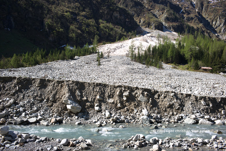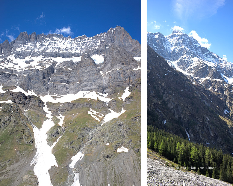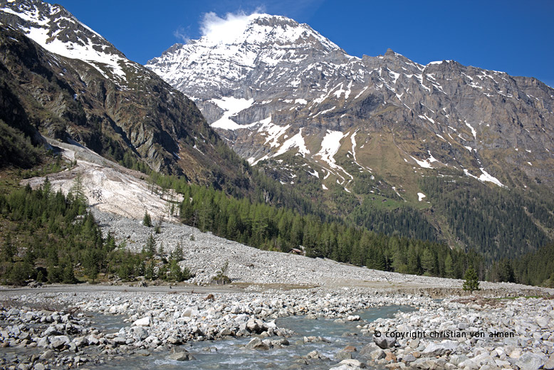 Auf meiner Wanderung im hinteren Gasterntal ist mir diese Sage durch den Kopf gegangen. Vor fünfzehn, vielleicht sogar zwanzig Jahren, die Zeit vergeht ja so schnell, bin ich zum letzten Mal hier hochgestiegen. Schon in Selden, dieser hübschen, romantischen Sommersiedlung sah ich, dass hier die Kander mit mächtig viel Geschiebe ihr Bachbett mit Gewalt erweitert hatte. Wie die Strasse dann, gleich hinter dem Hotel Gasterntal nach rechts über eine neue Brücke abbog, schwante mir nichts Gutes. Ich hatte vom grossen Unwetterereignis vom 10. Oktober 2011 im Kandertal gehört; eben eines dieser Jahrhunderthochwasser. Doch das Bild von Heimritz, die oberste Siedlung im Tal, machte mich dann doch sprachlos. An meinem Schrecken hat auch das herrliche Frühlingswetter nichts ändern können! Wo beim letzten Besuch noch Alpweiden waren, liegen heute tonnenweise Geröll, Steine und Felsblöcke.
