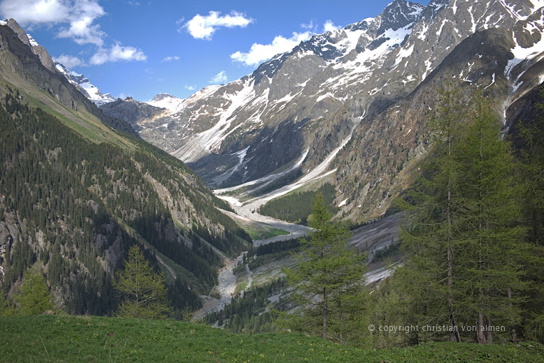 Wenn wir fast zuhinterst im Gasterntal, bei Selden, gegen den Lötschenpass hoch steigen, der ins Lötschental hinüber führt, erreichen wir nach knapp einer Stunde auf einem hübschen Weg, unter schattenspendenden Tannen und Lärchen hindurch die Alp. Von hier öffnet sich ein fantastischer Blick hoch zum Doldenhorn und auf den hinteren Talabschluss mit dem kaum noch sichtbaren Kanderfirn. Letzterer bildet den Zugang zu den Gletscherpassübergängen ins Lauterbrunnen- und Kiental. Derjenige ins Lauterbrunnental ist besonders zu empfehlen.