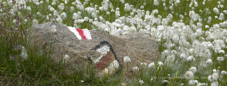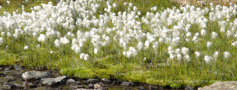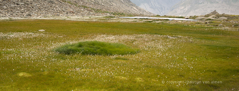 An vielen Orten ist das Ufer der Quellzuflüsse und Seelein mit Tausenden von Wollgrasblumen bedeckt. Schneeweiss leuchten die zottigen Köpfchen zwischen den vielen verschiedene Grau- und Grüntönen, wiegen sich im Wind, verleihen der Landschaft Frische und Leichtigkeit. Im kleinen Talbächlein vereinen sich die Quellwasser und wandern munter plaudernd von einem Wasserbecken zum nächsten.