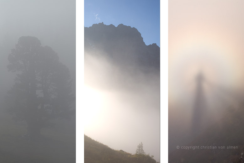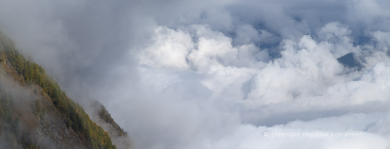 Nie ist das Licht heller und klarer, die Schatten dunkler und bodenloser als im Herbst. Am Himmel schwebt ein helles, luftiges Blau. Im Unterland ist der Himmel jedoch grau und trüb. Feucht und kalt dringt das Wetter durch die Kleider.