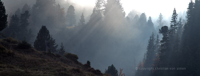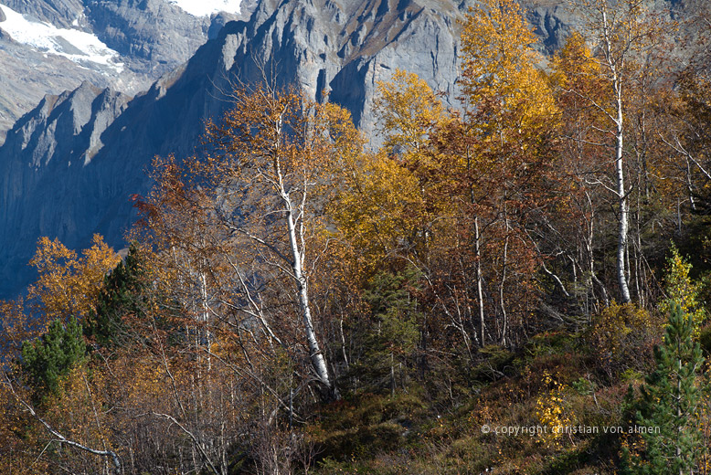 Wer jetzt das Glück hat hier oben zu wandern, dem eröffnet sich eine ruhevolle Welt, weitab von allem Alltagsgeschehen. An manchen Tagen leuchtet der Himmel in einem transzendierenden Blau über Gipfel, Alpweiden und Wäldern. Wie es eben nur im Herbst entsteht, wenn die Luft trocken und kalt ist. Oft liegt am Morgen schon frischer Raureif auf den Bäumen, Stauden, Sträuchern und Matten, manchmal sogar ein wenig Schnee. Doch wer nun bereits den Winter fürchtet oder ersehnt, irrt sich. Noch schlummert im Erdreich ein Rest der Sommerwärme und ich stelle mir vor, wie diese nochmals ihre Kräfte bündelt – zu einem letzten glorreichen Finale.