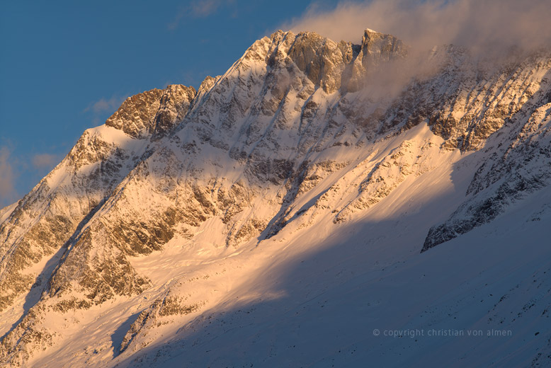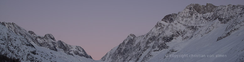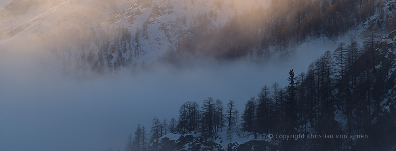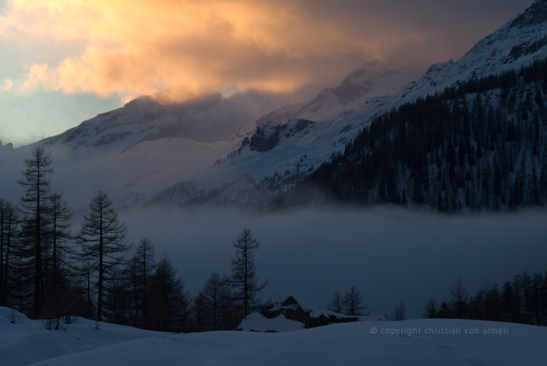 Wie so oft verliert sich die Zeit in dem unendlichen Raum der mich umgebenden Natur. Erst bei einem Blick über meine Schultern realisiere ich, wie der Tag im Tal unten langsam vergeht. Am Hockenhorn oben entflammen rotorange die Gratwolken. Ihr Licht spiegelt sich matt auf der Nebeldecke im Tal wider, verleiht der Ansicht etwas geheimnisvolles, archaisches. Vor mir legt sich das Abendglühen über die Berge, wandert langsam zur Lücke hoch, steigt weiter zu den Himmelsgraten, verweilt für eine kurze Atempause auf den letzten Gipfeln. Zurück bleibt das kühle graublaue Dezemberlicht.