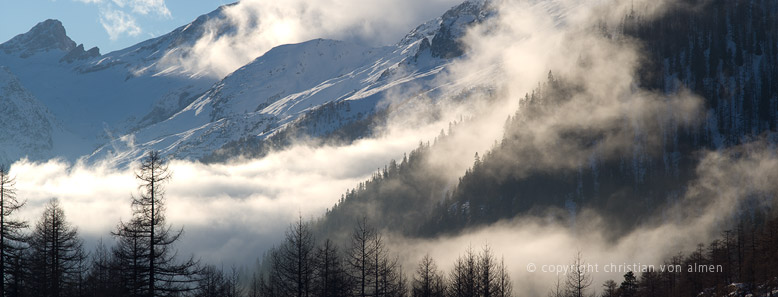Lötschental, Blatten am 10. Dezember 2015, kurz nach Mittag. Pünktlich hält der Postbus an der Endstation. Ich schaue mit wenig Begeisterung aus dem Fenster. Unten in Goppenstein, wo ich zugestiegen bin, lag der Nebel noch wie ein versiegelnder Deckel über dem Tal. Hier stecke ich nun mitten drin in den trübgrauen, dichten Nebelschwaden.