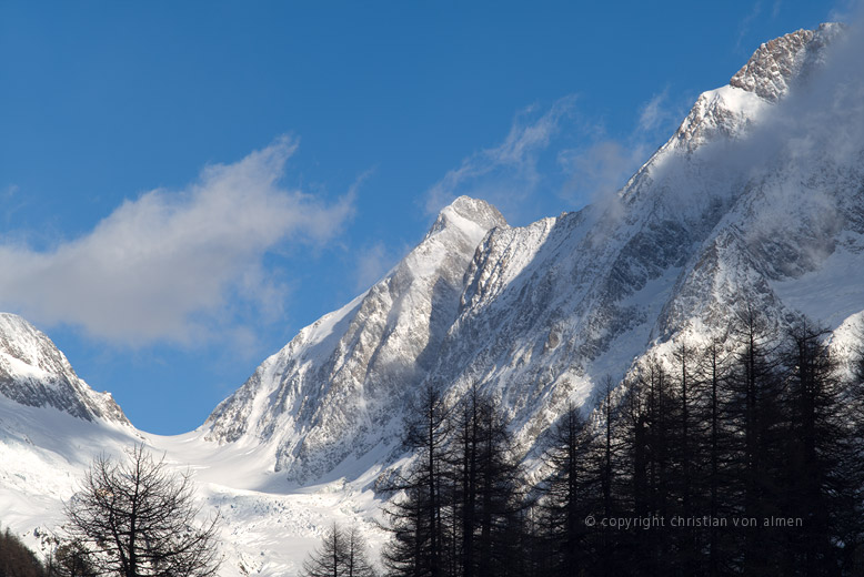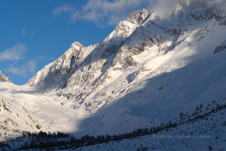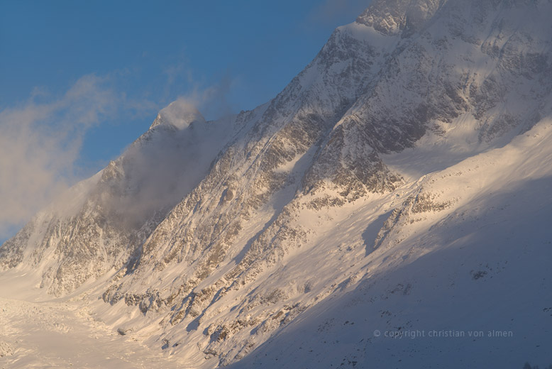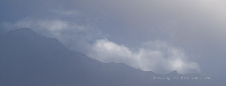In meinem Rücken,unten beim Gletscherstafel kämpfen Berg- und Talwind miteinander. Immer wieder brandet so der Nebel gegen die Falfleralp an, wabern einzelne Schwaden den Hängen entlang hoch, werden vom Wind wieder zurückgedrängt. Mit klammen Fingern wechsle ich das 50mm Objektiv gegen das 135mm aus. So verkürzt sich optisch die Distanz von meinem Standpunkt bis zu den Bergen im Talhintergrund um gut zwei Wegstunden. Das Bild im Sucher der Kamera sieht aus, als stünde ich unmittelbar vor den mächtigen Nordwänden und Nordgraten des Sattelhorns, des Distlig- und Schinhorns.