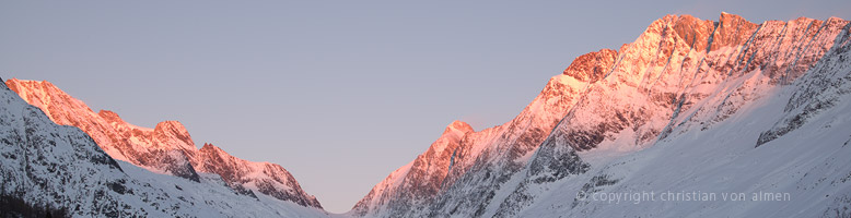 Warm leuchtet das Nachmittagslicht auf den Sonnseiten zu mir in den Schatten herunter. Vor mir liegt, eingebettet zwischen den Bergseiten, die weitläufige flache Ebene des Grunds. In deren Fortsetzung steigt der Langgletscher zu der Lötschenlücke hinauf. Diese bildet den Fluchtpunkt für die beiden Bergketten zu meinen Seiten. Die Lücke! Das verheissungsvolle Zutrittstor zu der schönsten, in sich harmonisch abgeschlossenen Hochalpinen Region der ganzen Alpen – die Heimat der mächtigen Ströme vom Grossen Aletschgletscher, dem Ewig Schneefeld und dem Finsteraargletscher. Doch eben auch das östliche Tor zum Lötschental, dem Tal des Lichtes.