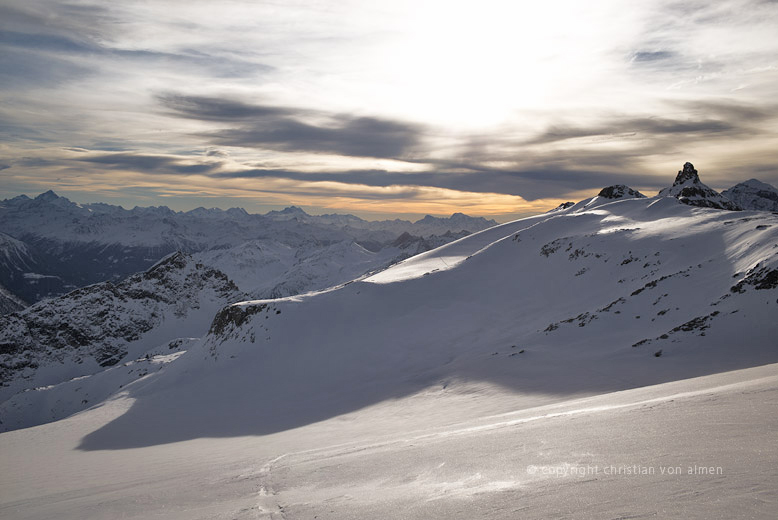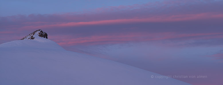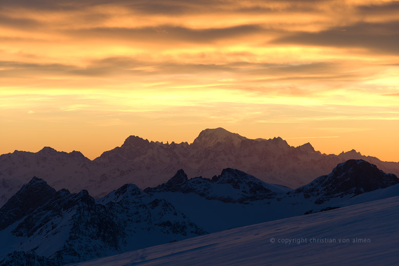 Kaum das ich die letzte Mulde erklommen habe, flutet das untergehende Licht der Abendsonne die ganze Landschaft um mich herum. Berge, Grate, Hänge und Gipfel erstrahlen in einem prächtigen Abendlicht. Schnell ist das Stativ aufgestellt, die Kamera angeschraubt, das passende Objektiv ausgewählt und ich mache, wie in einem Rausch, meine Aufnahmen.