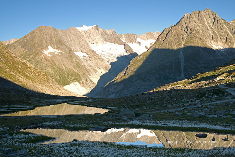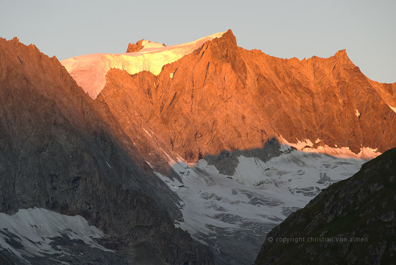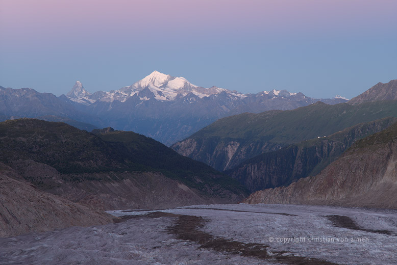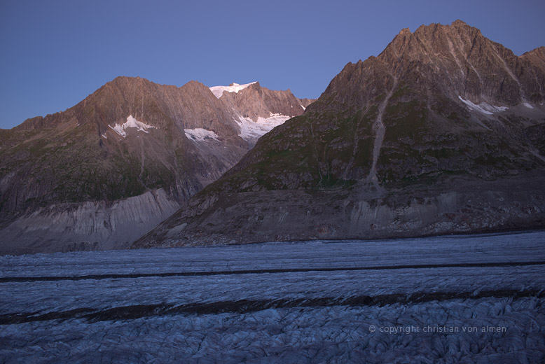 Ein wenig perdu suche ich Zuflucht bei der wohligen Wärme meines Sommerschlafsacks. Der harte Granitboden auf dem ich liege stärkt mir, im Angesicht dieser Unendlichkeiten, den Rücken. Mein steinernes Bett steht hoch über dem Aletschgletscher. Eine kleine, tischebene Aussichtsplattform, blankgeschliffen vom Gletschereis, während und vor tausenden von Jahren. Wieder so eine zeitlose Dimension.