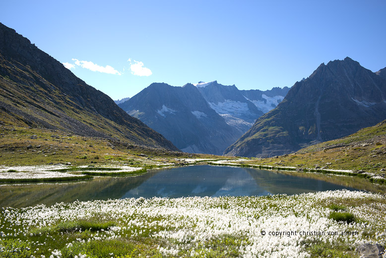 Bei meinem letzten Besuch (s. Blog Märjjelensee vom 2015) fand ich hier eine archaische Urlandschaft vor. Diesmal dünkt es mich jedoch, als ob ich mich fortwährend in einer idealisierenden Filmkulisse bewegen würde. Als ob ich mich unbemerkt in den Bilderlandschaften eines aufgepoppten Bergkalenders verirrt hätte. Alles scheint mir, ob der Weichheit des Lichtes, der warmen Luft, der satten Farben und sanften Konturen unwirklich.