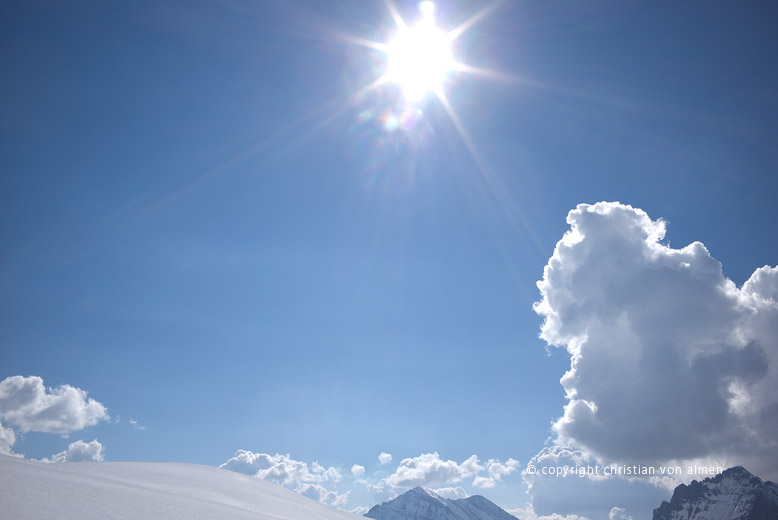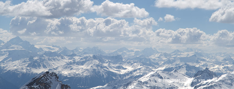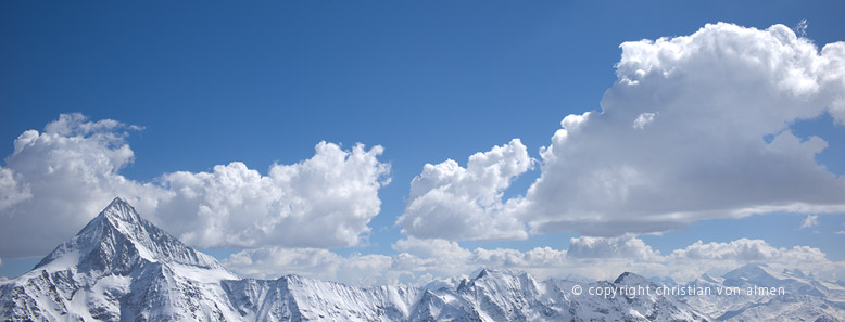 Darunter schimmern die Gipfel der fernen Walliser Viertausender herüber; allesamt Bergsteiger-Sehnsuchtsorte. Zwischen dem leicht cremig wirkenden Perlmuttweiss der fernen Schneeseiten und den strahlend leuchtenden Cumuluslandschaften sind Streifen von hellem Graublau; die flachgedrückten Unterseiten der vielgestaltigen Wolkenaufbauten.