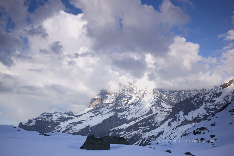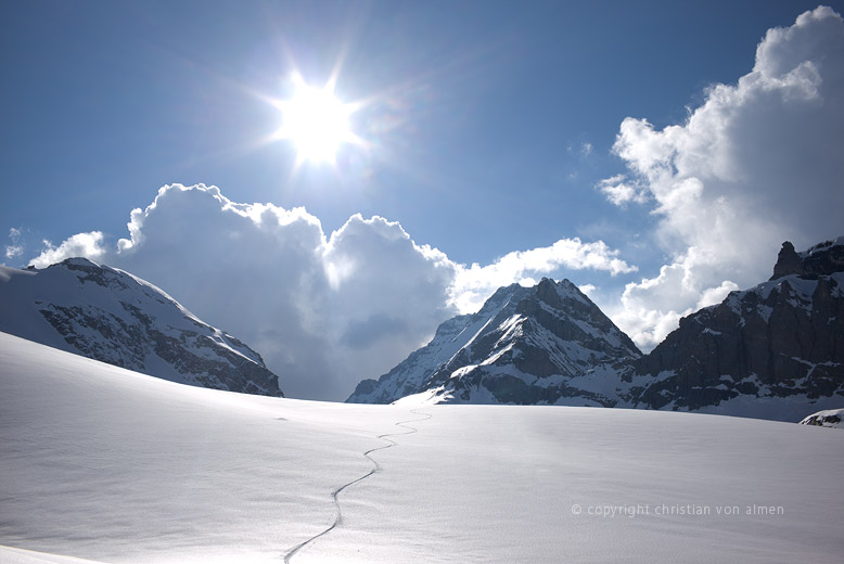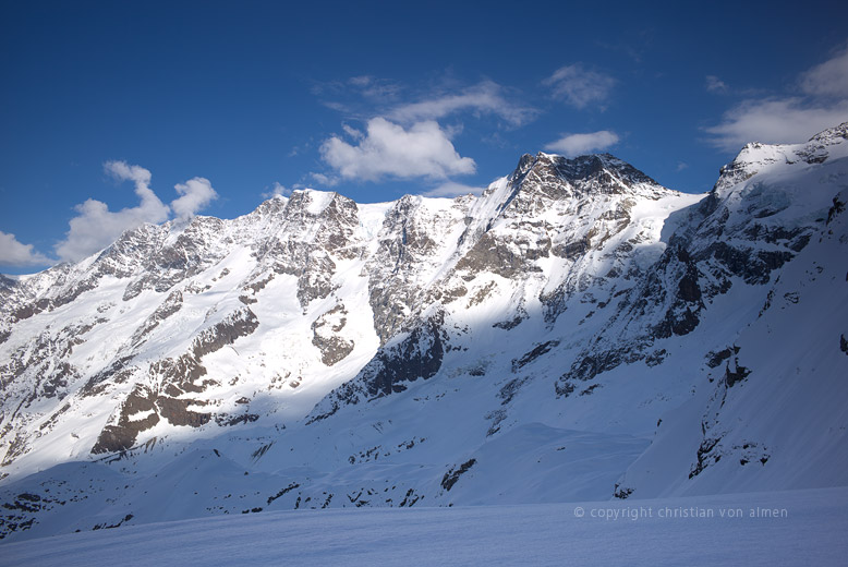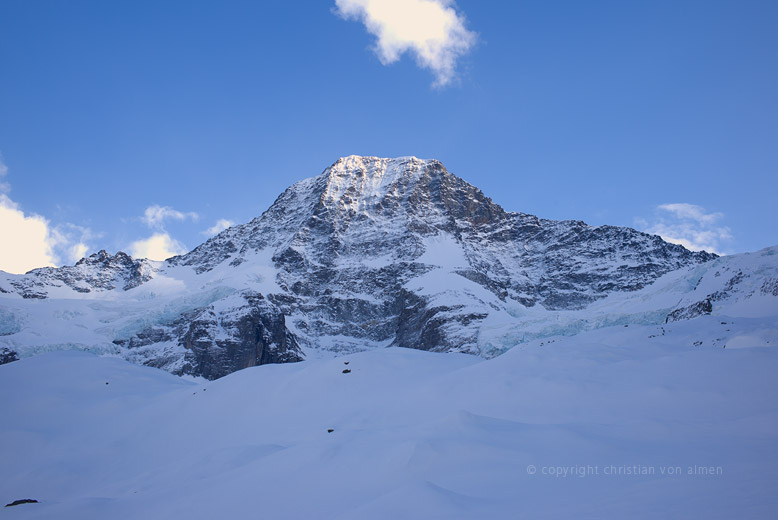 Am Ende des Tschingelgletschers traversiere ich unter der »Nordostwand« der Kanzel durch, welche die Sicht gegen oben versperrt. Da der Schnee nun anspruchsvoller ist, konzentriere ich mich im Steilhang ganz auf das Skifahren. Erst wie das Gelände flacher wird schaue ich wieder umher und erschrecke gewaltig. Wie ein riesiger Koloss überragt mich die mächtige Nordwand des Breithorns. Ehrfürchtig und andächtig halte ich einen kurzen Moment inne.